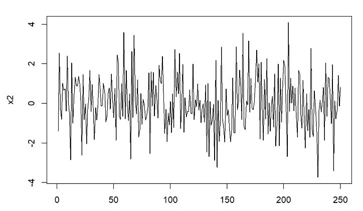 - La série \(X_2\) fluctue de manière irrégulière autour d’une moyenne stable, sans tendance ni cycle.