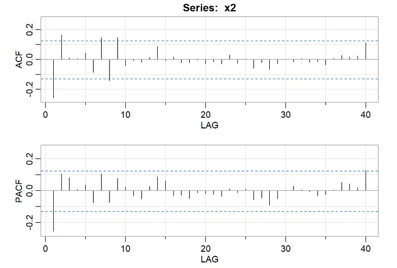 Les barres de l’ACF et de la PACF qui dépassent les bandes bleues représentent des valeurs significativement différentes de 0.