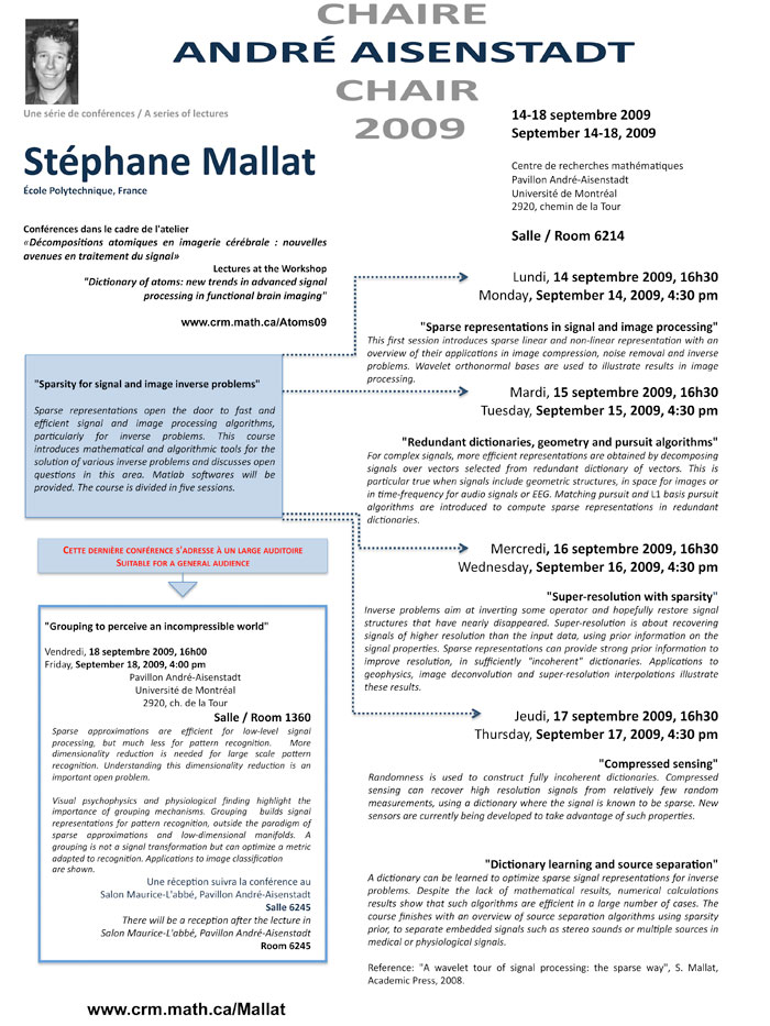Cette chaire permet d’accueillir dans chaque programme thématique (semestriel ou annuel) des mathématicien.ne.s de très grande renommée pour un séjour allant d’une semaine à un semestre. Les titulaires de la Chaire Aisenstadt donnent une série de conférences sur un sujet déterminé pour son intérêt et son impact dans le cadre de la programmation thématique, dont la première, à la demande du donateur André Aisenstadt, doit être accessible à un large auditoire. Ils sont également invités à rédiger une monographie dans la série CRM Monographs publiée par l’American Mathematical Society.